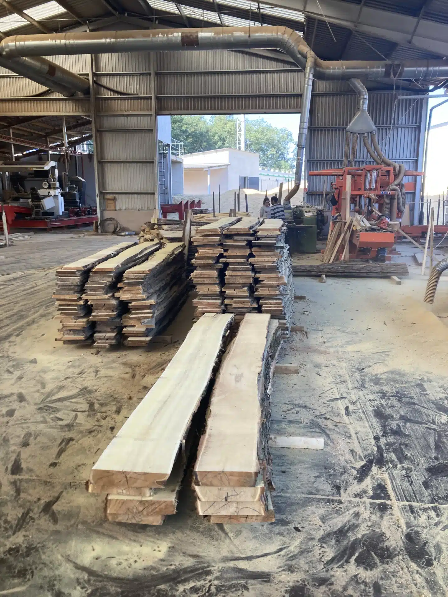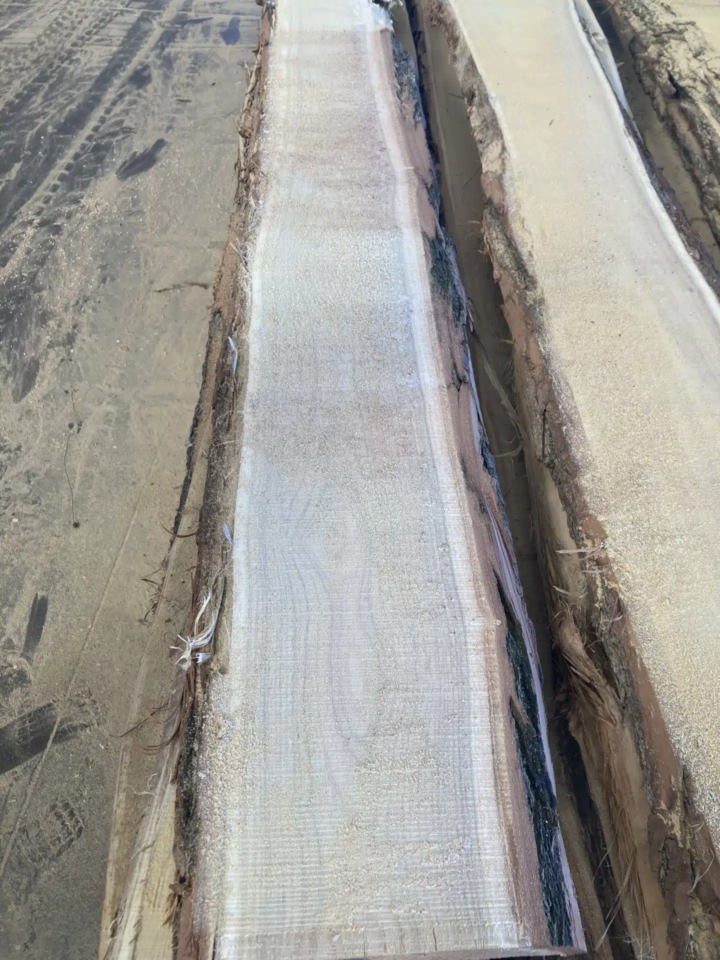 Cette planche de bois brut de sciage a été débitée en tranche par la scierie à partir d’un tronc de robinier. Il reste l’écorce, les arêtes n’ont pas été avivées. C’est la planche de bois massif la plus brute possible, qu’on appelle aussi un plot de bois, de 2m à 2,5 m de longueur.